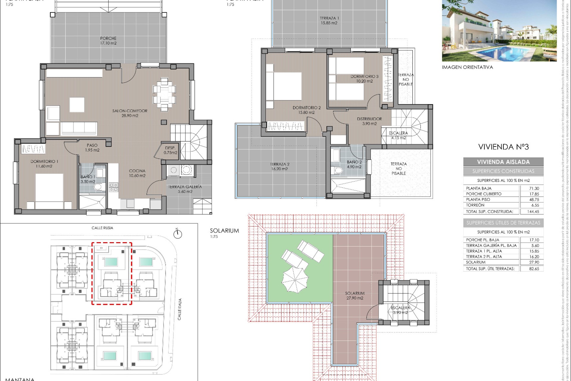 Este NUEVO PROYECTO se encuentra a 700 m de la playa de El Pinet, a 20 km del aeropuerto y a sólo unos minutos de los supermercados, bares y restaurantes locales y de las instalaciones de ocio. Uno de los mejores lugares para relajarse y disfrutar del sol y las playas de la Costa Blanca. Las ventanas son de doble cristal con persianas de aluminio, mosquiteros y puerta de seguridad. El jardín está totalmente embaldosado y su terraza está rodeada por una barandilla de cristal de seguridad. La sala de estar está equipada con una cocina abierta a una cocina completamente amueblada, campana extractora, fregadero de acero inoxidable, horno, vitrocerámica. La nevera y el lavavajillas no están incluidos, sólo las conexiones. En la planta baja también hay un baño con techo desmontable, donde la unidad central de aire acondicionado todavía puede ser instalada por el cliente. Desde la escalera, donde hay un almacén debajo, llegamos a los dos brillantes dormitorios con armarios empotrados en el primer piso. Hay una preinstalación de aire acondicionado central en cada dormitorio y un baño con plato de ducha. Un gran balcón con hermosas vistas al mar es un punto culminante. En el segundo piso hay una hermosa terraza con lavandería, rodeada por una barandilla de vidrio de seguridad. Las plazas de aparcamiento están en la propiedad y también en la calle.