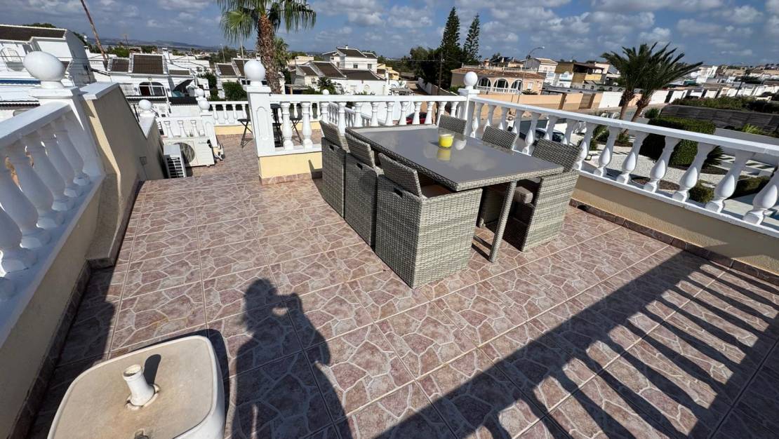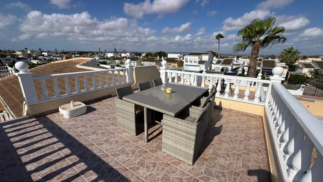 From the roof terrace, you can see the beautiful Laguna Rosa and the city of Torrevieja, among other things. The villa has a beautifully designed pool area with a built-in jacuzzi and a pool bar. The spacious terrace in the entrance area offers the ideal opportunity to enjoy the evening sun.