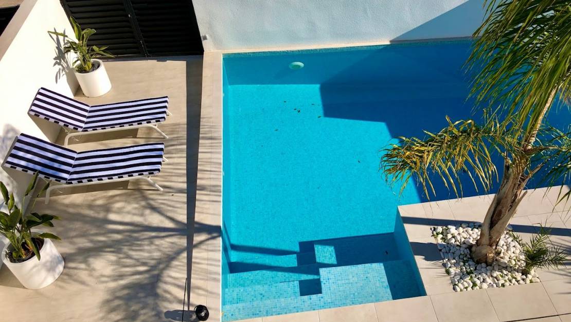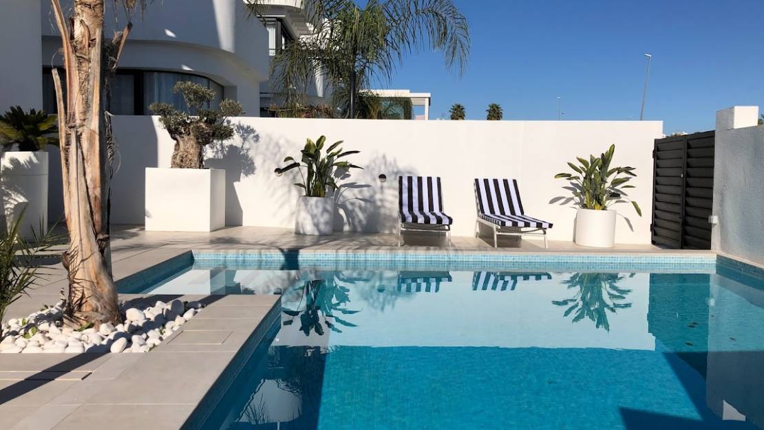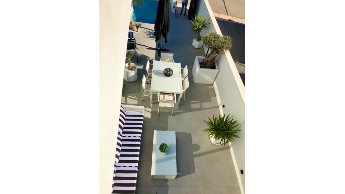 This exclusive villa has a rectangular urbanization facing east with an area of 127.23 m2. The house has a ground floor, first floor and a solarium connected by an internal staircase. Plot area in rectangle 201.60 m2. Terrace next to the pool 76.34 m2. Solarium 73 m2. the villa is completely surrounded by a fully paved garden, in the back of the villa we have 1 storage room.